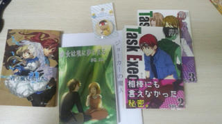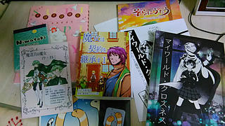 文学フリマ行ってきました。 日常生活。 2016年05月01日 こんばんは。創作する時間と意欲がめっきり減ってしまって憂いている管理人、きりです。完成させたいって気持ちはあるんですけどね、もう完全にエターなる道に一直線で怖い。さて、本日は創作意欲の刺激になるイベント、文学フリマに行ってきました。なお、サークル側の参加でいつものごとく、風亜ちゃんのところでお手伝いしてきました。(一昨日引いた風邪のせいで喉の調子が悪くて声出し殆どできなかったのは内緒)入場後は設営の準備では値札張ったりサンプル本の準備をしたりしていました。始まってからは主に店番と風亜ちゃんの雑談相手でした。開始から5時間ほどたったころ、店番中にもかかわらずこっそり風亜ちゃんの短編小説を読み始めたら額に衝撃が走りました。気づいたら目の前に掲げていたポスター(A4×3の厚紙)を支えていた金属棒がこちらに倒れてきていたのでした。そんなに痛くもなかったけどびっくりしました(´∀`;)そういえばこの小説を書いたときのUSBデータがーとか書いてあったし、この物語自体ホラー風味だし、何か曰くでもあるのかしらとほんのり怖くなったり……。なおその瞬間、私の中で今年の風亜ちゃんの誕生日プレゼントはポスタースタンド(ポップスタンド?)に決定しました。忘れんなよ自分。▼本日の戦利品(左からちょっと説明とか) ・青ノ風見鶏→ 見本誌スペースで立ち読みして、「約束」をテーマにしている(と思われる)とのことでちょっと気になったので購入。・彼女は現に夢を見る→ 風亜ちゃんの新刊。まだちょっとしか読み進めてないですが異世界転移モノです。主人公朝彦君の活躍と、ヒロインのジェンナちゃん(かわいい)を軸に進む話(だと思っている)。早く読んで恒例のチェッカー結果と感想送りつけたいです(´∀`*)・ジョーカーの魔人→ 風亜ちゃんの短編フリー配布コピー本。上記に書いたとおりホラー要素がありますが、オチがちょっと背筋がぞくってするくらいでホラー苦手な私でも読めました。リアルプチホラーがあったのは上記の通り。・Task Executer(vol.2, vol.3)→ 前回の文フリで1巻を買って、面白かったので続巻を買いました。裏稼業の何でも屋(ハンター)として働く青年2人のコメディありシリアスありの物語です。著者さんのサイトで1,2巻は読めるとのことですが、絵も好きなので本で買いました(´∀`*)主人公二人に私の好みの要素が入っているのでどちらも好きです。好きな要素はそれぞれ違うけど、少なくとも2巻パラ見した感じだときっとどっちかに決められなくなると思う_(:3」∠)_あ、好きな女子はいまのところルナリアちゃんです。・缶バッジ別のイベントで風亜ちゃんが「きりちゃんっぽい」という理由で買ってきてくれた、文鳥の缶バッジ。そうです文鳥大好きです、知らなかったにもかかわらずよく選んできてくれましたさすがです(`・ω・´)ありがとーう!ちなみに白文鳥はもっと好きです!←……実を言うと大伝勇伝の15,16巻とD.backupも買ったまま積んである状態なので早く読みたいんですが如何せん今は時間がない(´;ω;`) 特にD.backup読みてぇ……超分厚いからハードル高い。。。