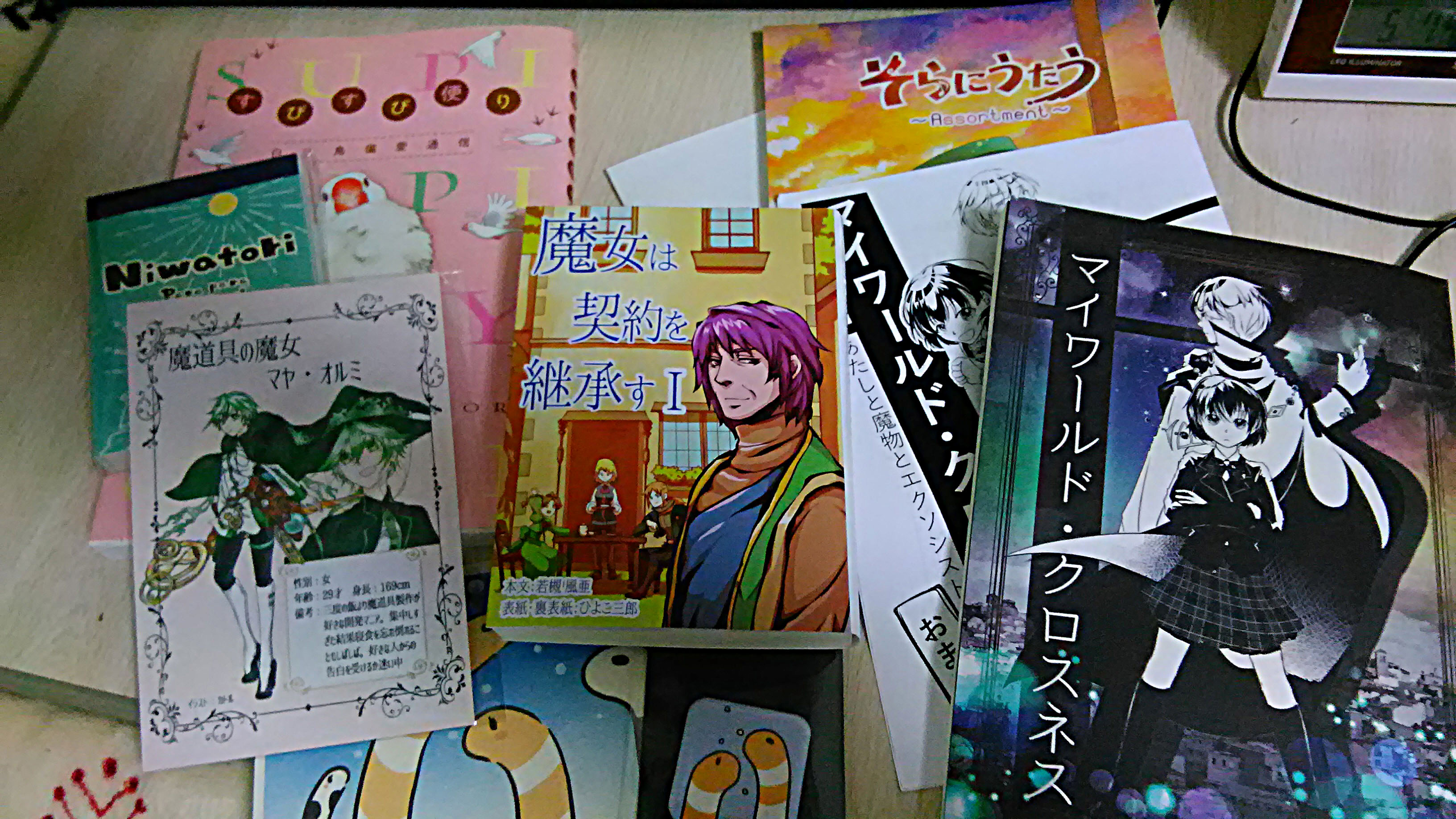 コミティア120いってきました。 日常生活。 2017年05月07日 こんばんは。久しくお絵かきしていなかった管理人、きりです。風亜ちゃんの個人サークルの売り子として、昨日はコミティア120へお手伝いに行ってきました。▼戦利品・風亜ちゃんの新刊「魔女は契約を継承す」の第一巻・鳥系大好きなので鳥系の漫画とメモ帳・自称エクソシストとバイト巫女さんのコメディっぽい小説(立ち読みしてのばらちゃんと高橋君の掛け合いにクスリときたので購入)・ニシキアナゴのポストカードと缶バッジ(姉がニシキアナゴ好きなので)やはり創作系のイベントに出た後は創作系の作品を作ったり遊んだりする意欲がわきますね。昨日はフリゲをやったりザクザク落書きしたりしてました。久々だけど、楽しい(´∀`*)最近はずっと作られたものを消化するだけの生活なので、何かを作ることもしていきたいなーなんて思ったりはするのですが、平日は仕事から帰ってきてもやる気力がでなくて困っちゃいますね^^;