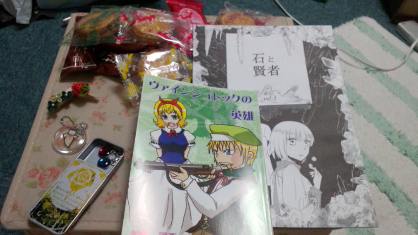 コミティア101いってきました。 日常生活。 2012年09月02日 こんばんは。タイトル通りコミティアに行ってまいりました管理人、きりです。ではでは早速、本日の戦利品!!(ジャジャーン左上から・風亜ちゃんから大量にいただいた非常食お菓子・お花とぶどうデザインの木製クリップ→これ、細い色紙をくるくる巻いて張り付けてあるみたいです。作者さん器用(´∀`*)・クリオネのキーホルダー→かわいかったので購入(`・ω・´)かわいいは正義!・赤いバラ、青いバラがデザインされたファスナーホルダー、黄色いバラのプチ缶ケース→バラはどう見てもIbを彷彿とさせてしまい買いました。 缶ケースなんか赤青黄全部そろえようかと思ったくらいです(笑) さすがに声はかけてきませんでしたが、このカラーリングでそろえてきているということは、きっと作者さんもIb知ってると信じてる!!・「ヴァインシュトックの英雄」→風亜ちゃんの新刊~。帰ってきてから2時間ちょいくらいかけて読了しました。 感想は後でメールする予定。 とりあえず一言だけ「レギさんがんばれ、超がんばれ!応援してる!!」 誤字脱字も……ちょっとだけ見つけちゃいました←・「石と賢者」→鉱物スキーな作者さんが描いた四コマ本。 なんかいい本ないかなぁとうろうろしていた時に偶然発見した本。終始ほのぼのした感じです。私も鉱物にときめくタイプなので、一目ぼれでした(´∀`*) 鉱物の利用方法がぶっ飛んでて続きが楽しみです^^(柔らかいムーンストーンからとれるカルピスとか……ww)前回は本が多めだったので、今回はグッズを中心に見てきました。なかなか面白いものが手に入ってホクホクです^^あと、風亜ちゃんの帰りの準備の際、少しだけ売り手側の席に座らせてもらったのですが、なぜかすごくわくわくしました←お前何も出品してないだろって突っ込みは受け付けます(`・ω・´)次回もし参加する機会があれば一緒に出たいなぁとか思ったり^^2人のほうが色々楽だろうし(席が狭いということを除けば)もし迷惑でなければ風亜ちゃんよろしくでs(ryでは報告はここまで! PR