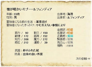 長生き君。 日常生活。 2008年09月21日 今晩和。お菓子作っちゃいました管理人、きりです。芋ようかんみたいなスイートポテト?的な物を作りました。底にクラッカー使ったのは失敗でしたorz今日はTheGoldenLoreのおはなし。しろだまさんに勧められて始めた放置型冒険ゲームです。姉に「モプー」と適当に名付けられた彼ですが、意外と長生きしております。▲今日のモプー。情熱もあがって元気です。姉も一緒に始めたのですが、早くも3代目。それとも私のモプーが長生きなのでしょうかねww長生き君魔力型です。雷魔法を利用しております。うちに発電しに来てくれないかな……。 PR