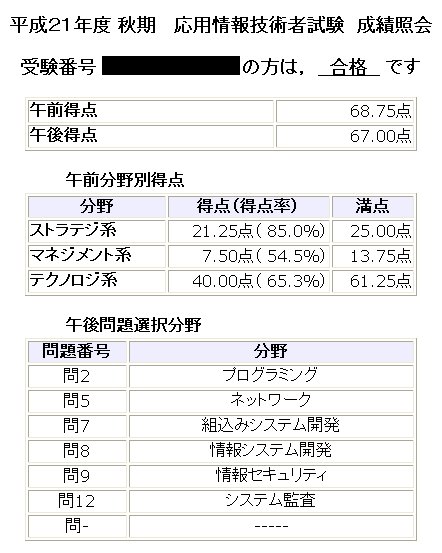 まさかの。 日常生活。 2009年12月21日 今晩和。応用情報合格しましたが、実感が湧かない管理人、きりです。本日、10月に受けた応用情報技術者試験の結果発表がありました。その結果、なぜか合格していました!!Σ(゜Д゜;)試験勉強なんて殆どやっていなかったのに(問題集数ページと、模擬試験2回分くらい)この結果でした。ううむ、嬉しいけれど何だか複雑な気分……。問2でプログラミング(恐怖の擬似言語)を選択した時点で\(^q^)/と思っていましたが、意外ととれたみたいです。この調子で最後の資格試験、Oracleもがんばらなー!! PR